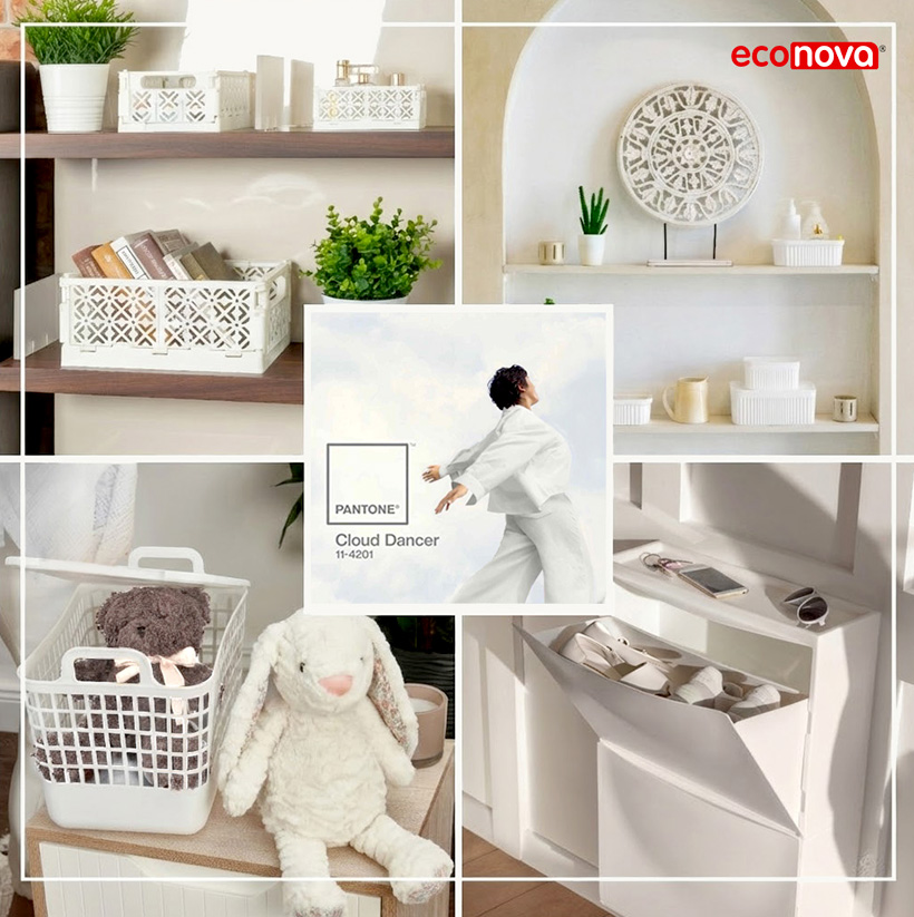 Почему Stocky идеально поддерживают тренд Cloud Dancer: у них лаконичный, «воздушный» дизайн — перфорация визуально уменьшает объем ящика, мягкий белый оттенок позволяет выстраивать спокойные композиции на открытых стеллажах, а также складные конструкции помогают снижать визуальный шум: неиспользуемые ящики можно сложить стопкой, когда они не используются.
