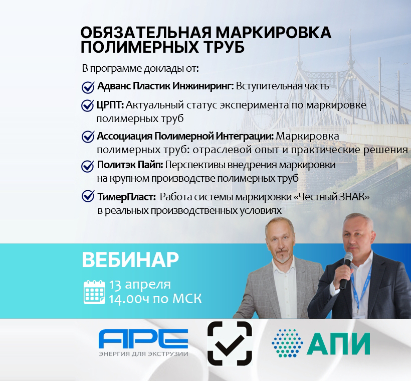 Компания «Адванс Пластик Инжиниринг» (АПИ) совместно с Ассоциацией полимерной интеграции (АПИ РФ) проведут 13 апреля онлайн-мероприятие на тему: «Обязательная маркировка полимерных труб: регламенты, вопросы, решения».
